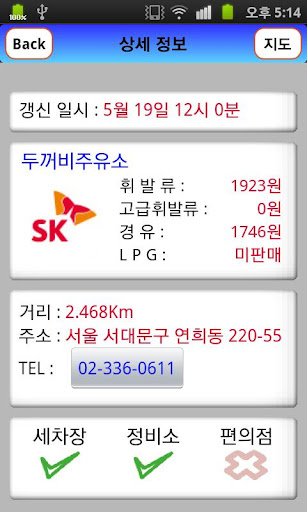 이동합니다. 상세페이지에서는 갱신 일시, 유류 가격, 거리, 주소,전화번호(누르면 발신), 편의시설의 정보를 제공합니다. 지도 버튼을 누르면 지도 정보를 제공하고 현재 위치와 해당 주유소 위치를 보여줍니다. 주소로 검색한 경우에는 현재 위치는 나오지 않습니다.