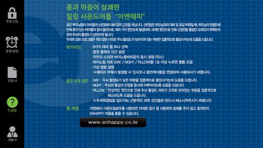- 제공되는 기능성 소리에는 알파파, 델타파를 유도하는 바이노럴비트(Binaural Beat)가 삽입되어 있습니다. 이어폰이나 별매품인 해피슬립-사운드 필로우를 사용하여 들으시기를 권장합니다.