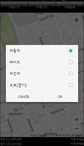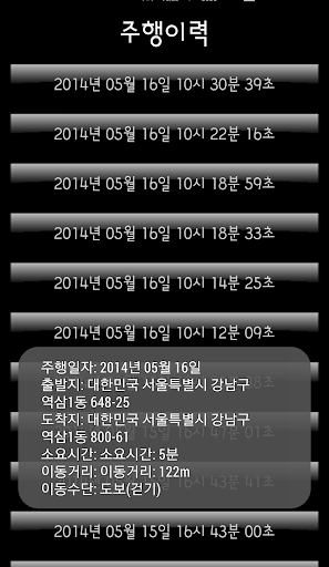 3. 주행 완료 버튼을 누르면 이력이 저장되며, 메인메뉴의 이력보기에서 주행이력을 확인할 수 있습니다.