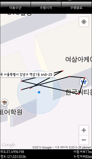 주행 시작 시 20초 단위로 갱신하여 이동 경로를 표시합니다.