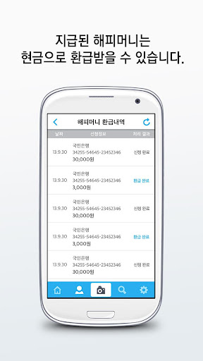 적립 해피머니가 1만원 이상일 때부터 하단 탭의 ‘내정보’ > ‘해피머니 환급하기’를 통해 현금으로환급이 가능하며, 환급 단위는 10,000원입니다.