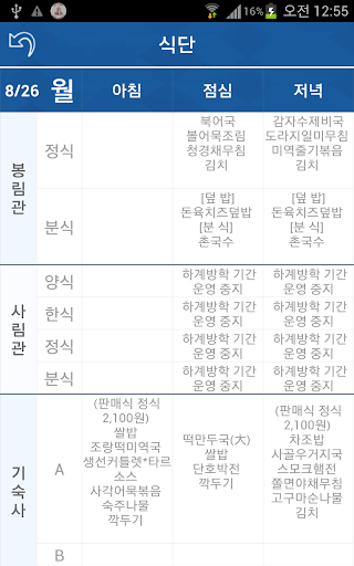 봉림관, 사림관, 기숙사, 교직원 식당의 식단 을 한눈에 살펴 볼수 있습니다.