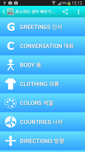 인사, 대화, 방향, 음식, 외식, 응급상항, 쇼핑, 숫자, 관심사, 언어, 자주 쓰이는 동사, 형용사, 교통수단, 가족, 시간, 패션, 나라, 느낌, 몸, 직장, 날씨, 색깔 등