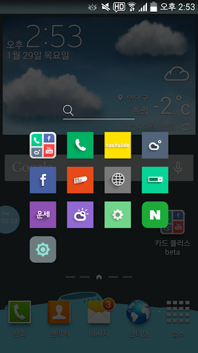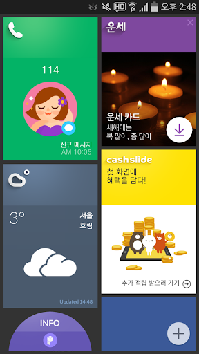 - 기본 탑재: 통화, 페이스북, 날씨, 운세, 실시간 검색, 11번가 쇼킹딜, 캐시슬라이드