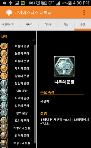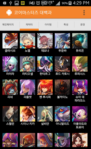 이 어플리케이션은 코어마스터즈에서 플레이 해볼 수 있는 캐릭터 및 아이템, 스킬등을 한눈에