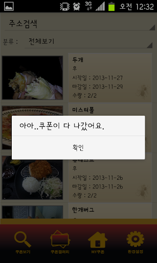 먼저 쿠폰보기는 분류를 통하여 도시, 구, 음식 분류를 통한 검색이 가능합니다.