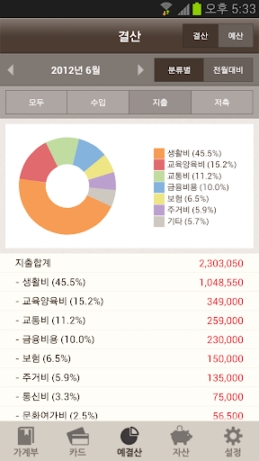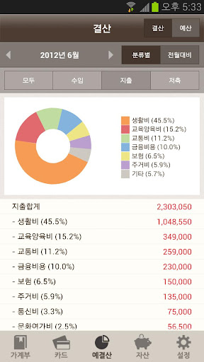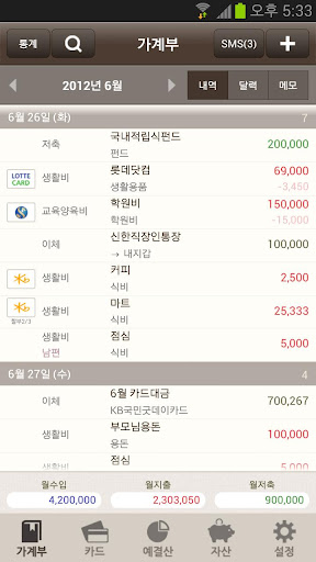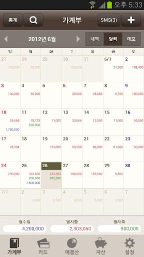 SMS로 가계부를 손쉽게 작성할 수 있으며 일별 합계를 달력과 함께 한 화면에 볼 수 있어 작성과 동시에 가계현황를 알 수 있습니다.