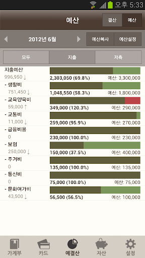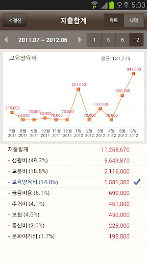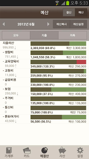 - 분류별 예산설정과 예산대비 실적 그래프 제공
