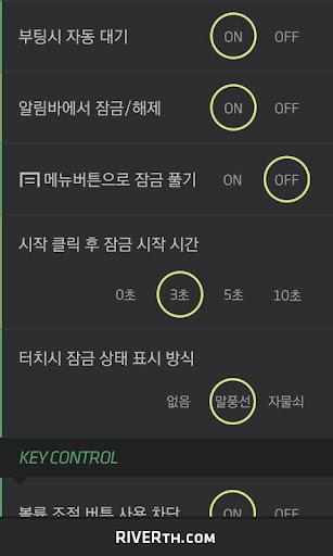- 잠금 : 상단의 슬라이드를 내리면 알림바에 보이는 '터치 잠금 작동'을 눌러주시면 잠김.
