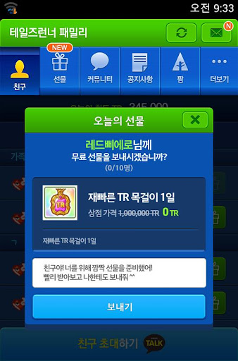 테일즈런너 패밀리 유저들에게만 드리는 대박 컨텐츠 "오늘의 선물" 기능을 통해 매일매일 친구에게 공짜로 아이템 선물을 할 수 있습니다.