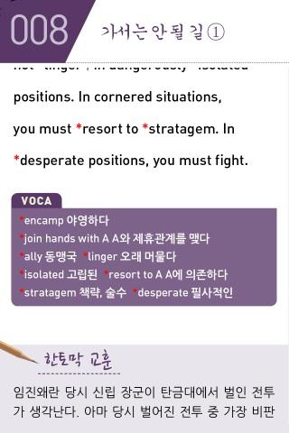 - , , 을 구문별로 쪼개서 구성함으로써, 매일 출퇴근길 혹은 여유시간에 이용할 수 있다.