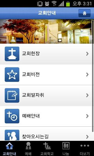 1. 교회안내 : 사명과목회철학, 사역소개, 예배와 모임안내, 섬기는분들, 오시는길, 교회행사사진