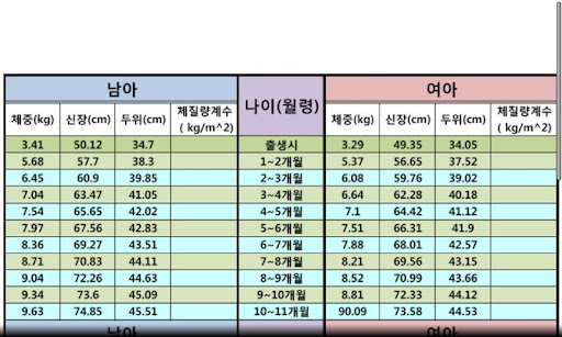 한국소아 발육 표준치(2007~2012년)입니다.