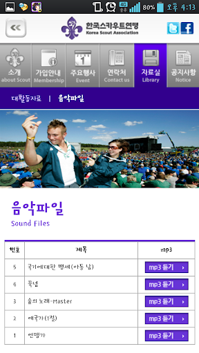 본 어플리케이션은 한국스카우트연맹의 소개 및 정보전달을 위해 제작된 어플리케이션으로서, 주요 사무처 및 수품대리점, 그리고 단위대의 연락처와 함께 주요 행사의 국·영문 소개글, 대활동 자료와 음악파일을 제공합니다.