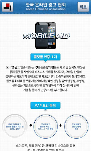 한국온라인광고협회는 정부의 지원을 받아 국내 플랫폼의 경쟁력 강화 및 신뢰도 향상을 도모하고, 관련법을 준수하여 사회적 부작용 방지에 기여하기 위해 모바일광고 플랫폼 인증제를 운영하고 있습니다. 인증위원회가(주체), 플랫폼사업자의 자발적인 신청을 받아(신청), 모바일광고플랫폼을(대상), ‘안정성’, ‘투명성’, ‘신뢰성’을 기준으로 구성된 평가항목에 따라 심사하되(기준), 각 항목 당 배점의 총점이 일정 기준 점수 이상인 경우 인증마크를 부여(방법)하고 있습니다.