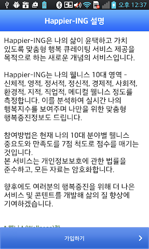 본 서비스는 개인정보보호에 관한 법률을 준수하고, 모든 자료는 암호화합니다. 향후에도 여러분의 행복증진을 위해 더 나은 서비스 및 콘텐트를 개발해 삶의 질 향상에 기여하겠습니다