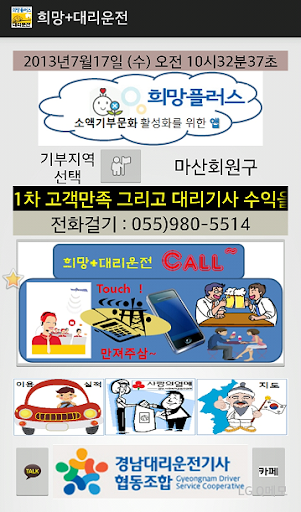 대리운전기사협동조합에서 운영하는 앱으로서 협동조합(콜센터 및 프로그램 운영), 대리운전기사 및 고객 모두의 희망(기대)을 플러스(+) 한다는 개념의 앱으로서 고객 본인의 사용 이력 및 적립금, 기부내역을 인터네을 통해 확인할 수 있을도록 하며, 대리운전 요청시 현위치 조회 기능과 전화번호를 다이얼하는 대신 원하는 기부처의 전화를 통해 Two-Touch로 대리운전을 요청하는 고객용 앱임.