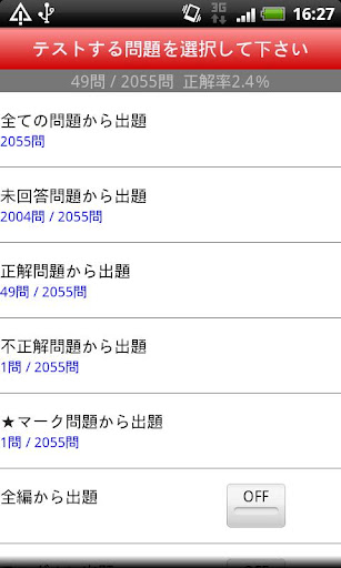 「問題を解く」メニューには「全ての問題から出題」「未回答問題から出題」「正解問題から出題」「不正解問題から出題」「★マーク問題から出題」の5種類があります。また,学習スタイルにあわせて「全編から出題」「ランダムに出題」を選択することができます。まずは「全ての問題から出題」からスタートしましょう。