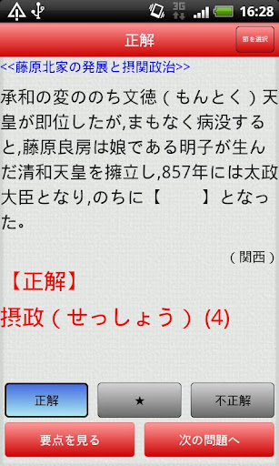 問題画面には「正解」「不正解」「★」のボタンがあります。知識が曖昧な問題には「★」ボタンを押しておくことで,トップメニュー「★マーク問題をチェック」より要点を参照しながら効率よく学習を進める事ができます。