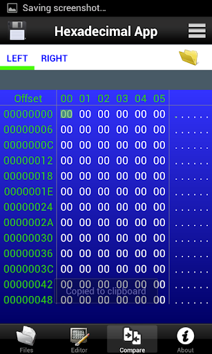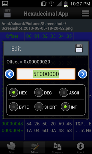 Hexadecimal app that edits ASC II, Decimal, and Hexadecimal. Able to use Byte, Short, and INT for editing the data accordingly. Also comes with a compare file functionality along with search and jump to (offset). The compare files function shows similarities in both files, for easier editing and functionality. Application only comes in English for now.