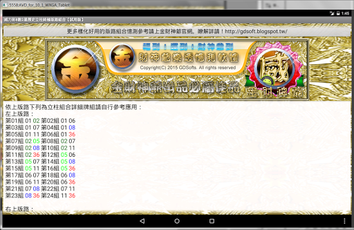 本試用版限制為按【下一期】只能到獎號前三期止,無法按到當期。主旨為可按【上一期】向上比對歷史以立柱終極版路組合效果之用。意者請支持正版購買威力彩8數2星歷史立柱終極版路組合。展示畫面為【組合版路】畫面。自動更新獎號隨開即可參考期期都可比對結果,操作簡單易懂並結合特殊立柱版路專攻二星雙星對仔用戶設計出好用軟體。特別推荐【終極版路】暫時不公開展示僅供用戶使用,不過這組開的最好。