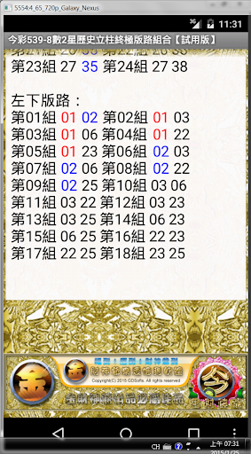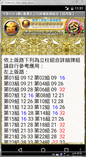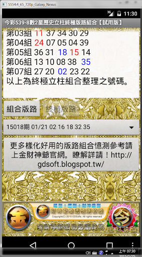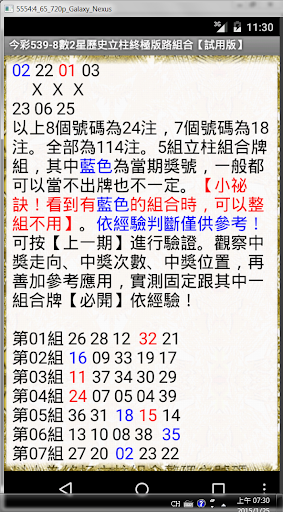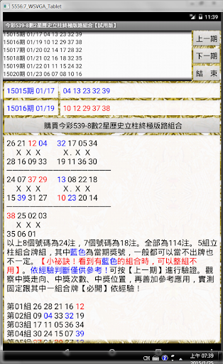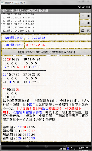 所謂8數2星說明:8個號碼以立柱4數X2列共8個號碼再搭配獨特特殊金財神爺算試組合2星而生成的號碼組合。本試用版限制為按【下一期】只能到獎號前三期止,無法按到當期。主旨為可按【上一期】向上比對歷史以立柱終極版路組合效果之用。意者請支持正版購買今彩539-8數2星歷史立柱終極版路組合展示畫面為【組合版路】畫面。自動更新獎號隨開即可參考期期都可比對結果,操作簡單易懂並結合特殊立柱版路專攻二星雙星對仔用戶設計出好用軟體。特別推荐【終極版路】暫時不公開展示僅供用戶使用,不過這組開的最好。
