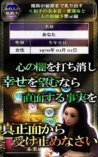 「将来への不安が常につきまとっている」「この先、巡り会う運命の人はどんな人なのか」「片思いの行方、最後はどうなるのか」……あらゆる悩みに対して的確な答えを導き出し、現実のすべてを明らかにします。