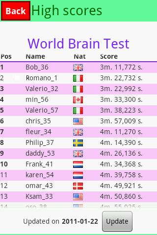 ... and when you feel confident, play with the World Brain Test mode and try to get the best score: your name and the flag of your Country will be shown in the Online World Ranking of 1 Minute Game!!!