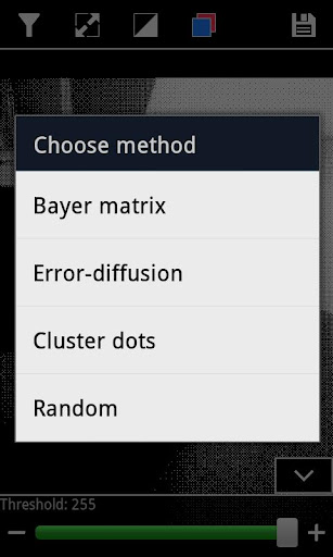 - Photo filters which let you apply four different dithering methods: Bayer matrix, Cluster dots, Error diffusion, Random..