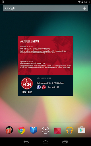 Das offizielle Android Widget vom 1.FC Nürnberg. Es zeigt dir jederzeit die zwei aktuellsten News auf deinem Home Screen an. Durch einen Klick gelangst du direkt auf den jeweiligen Artikel in der offiziellen 1.FC Nürnberg Android App. Zusätzlich ist noch ein Countdown bis zum nächsten Match zu sehen.