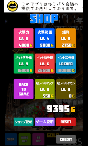 手に入れたお金でファイアバーの強化や自動攻撃ボットの購入・強化ができます。