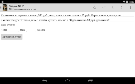 The application contains tasks from book «1001 tasks for mental calculation» by S. A. Rachinskiy.