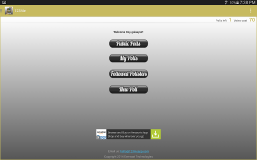 123Me introduces the concept of Personal Polling™. Trying on new sunglasses? Not sure which ones look best on you? 123Me comes to the rescue. Snap a few selfies and presto! You have created a poll, published on your Facebook feed or any social network you have installed on your smartphone. Receiving instant feedback on your possible new looks. Sunglasses, cars, phones, politicians, houses, funny faces, the ideas are endless for the polls you can create and enjoy with your online family, friends and followers. Have some fun! 123Me is released for beta on Android and coming soon to iOS. Get it, poll it, love it!