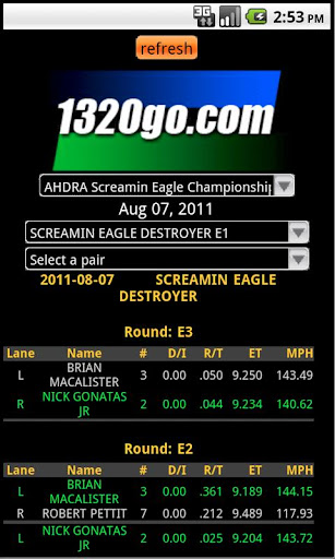 Bring drag racing LIVE to your Android device with 1320go LiveTimingOnline. If your favorite track or series has 1320go Live Timing, you can watch the racers' times and speed as they go down the track, know who won, and have the weather details too.