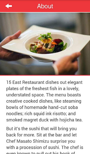 15 East Restaurant dishes out elegant plates of the freshest fish in a lovely, understated space. The menu boasts creative cooked dishes, like steaming bowls of homemade hand-cut soba noodles; rich squid ink risotto; and smoked magret duck with hojicha tea.