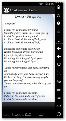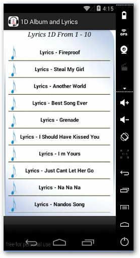 App One Direction Song Lyrics is an application free that displays the lyrics of the most popular One Direction and certainly very easy to use, here will provide information on how each month's most popular lyrics. This Free application is facilitated so that you download and installed directly on your mobile phone.