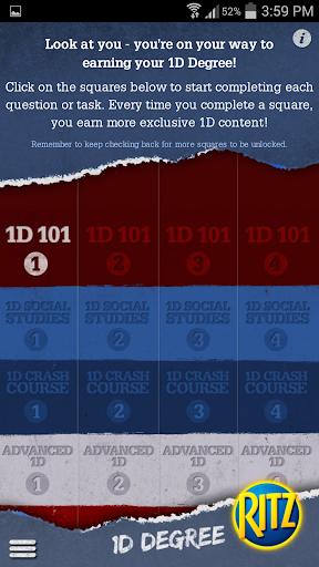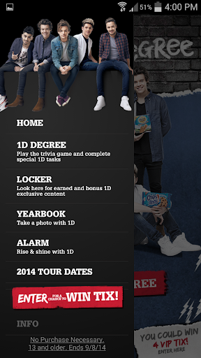 Be the ultimate One Direction know-it-all and get your very own 1D Degree! Pose with the band in the interactive photo booth feature and download original wallpapers, ringtones, and alarms. Get exclusive voicemails, text and video messages from the band and watch exclusive behind-the-scenes videos. Answer 1D trivia to earn your 1D Degree and unlock super-secret stuff we can’t even tell you about! Download the 1D Degree app now to get up-close and personal with your favorite band. Standard data rates may apply.