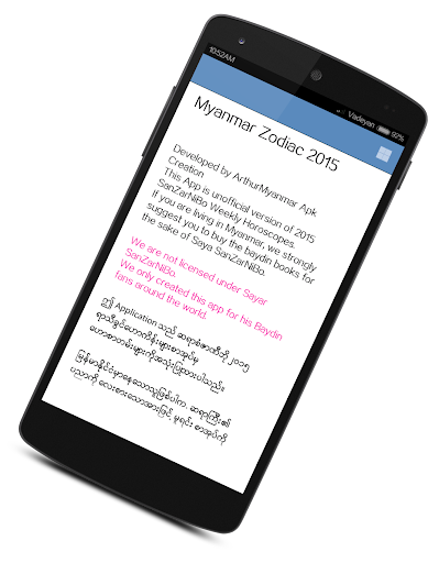 This application include astrology articles for 2015 written by Myanmar famous astrologer ,Sayar San Zar Ni Bo.