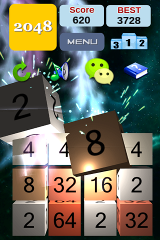 2048 3D中文版的界面突破性的采用纯3D环境,方块之间的碰撞和交互更加刺激直观,支持360并无死角的视角旋转、移动及缩放,玩法新颖独特,打击感强,非常耐玩的一款手游! 游戏中更是体贴的加入了一键分享功能,可以方便的直接对当前屏幕进行抓屏截图,支持分发到短信,邮箱及主流微博社交网站,有了好成绩一定要记住向朋友们好好炫耀一番哟!
