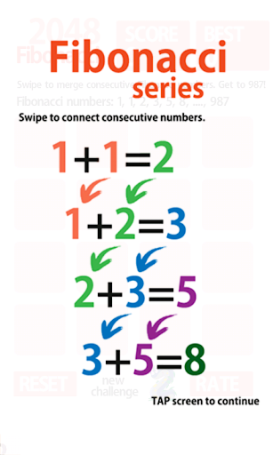 2048 Fibonacci series: 1, 1, 2, 3, 5, 8, 13, 21 ..... 2584. (you can continue up to 832040 tile).