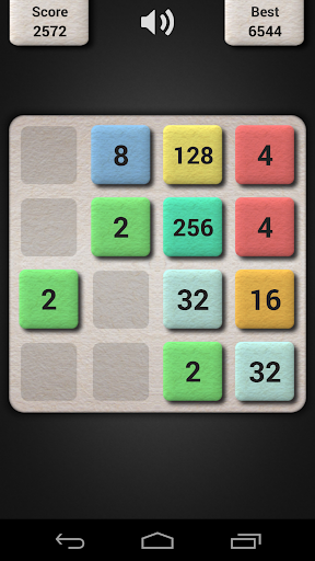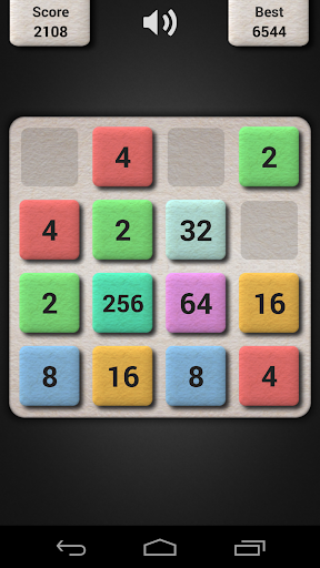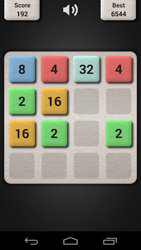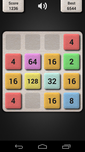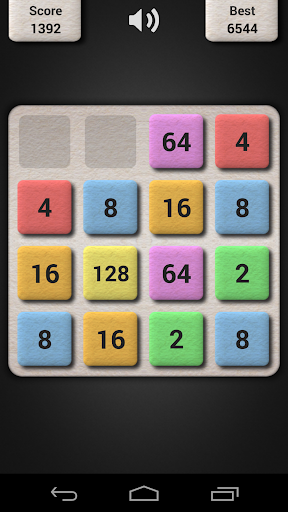 When two tiles with the same number touch, they merge into one tile with doubled value (2+2=4, 4+4=8, ...) and new tile with either number 2 or 4 is created on the random position.