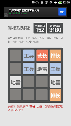 移动方块,合并两个地雷你会获得工兵,合并两个工兵你会获得排长,以此类推,看你能不能获得司令、拿到军旗!