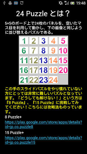 『24 Puzzle』とは5×5のボード上で24枚のパネルを、空いたマス目を利用して動かし、数字の順番通りに並び替えるパズルゲームである。