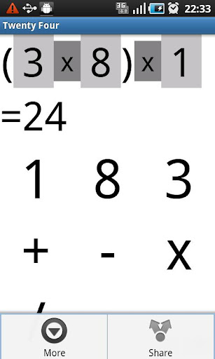 在這個遊戲中,將隨機選取三個數字,範圍從1到9。它要求孩子選擇這些數字和運算,並把它們放在屏幕頂部的框框中。計算時只涉及加,減,乘法和除法。如果得到正確結果,它會有提示信息。然後,將呈現另一組數字。如果不能得到正確答案,他/她可以按“提示”按鈕以顯示答案。