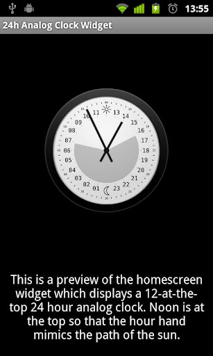 This is a homescreen widget that displays a 12-at-the-top 24 hour analog clock. Noon is at the top, so that the hour hand mimics the path of the sun.