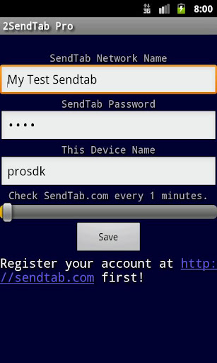 To send a URL from your Android, in any application that supports it (like your web browser, for example), use the "Share" or "Send to" feature to send the URL to "2SendTab Pro" - it will then popup and give you a list of your registered http://sendtab.com target devices. Click on one to send it, it's that simple!