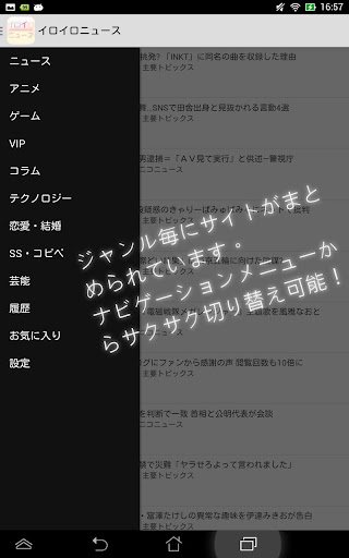 ・ナビゲーションメニューからジャンルを選択して切り替え可能