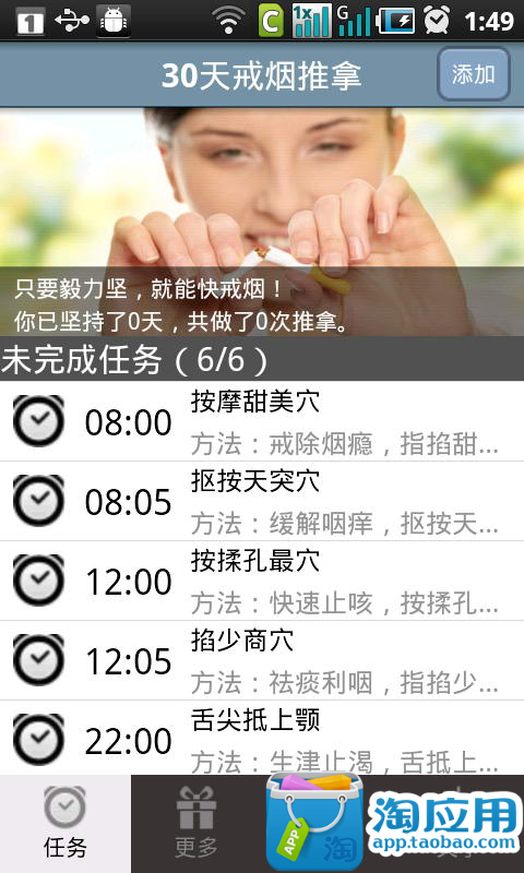 戒烟不容易,全靠意志力就更不靠谱!戒烟需要有好的方法来辅助!这套戒烟的自我推拿法已有超过2万人使用,用户全部好评,快来加入吧!科学研究表明,人用21天就可以培养一个习惯,相信你30天能够戒烟成功!========医学知识:香烟含有尼古丁等成分,可作用于神经系统,少量吸烟可以醒神、提高注意力、放松、缓解孤独;但大量吸烟,损伤肺脏、肝脏、脾胃以及神经系统,引起咽干、口苦、恶心、咳嗽、痰多、新陈代谢异常、疲乏、肌肉抖动、嗜睡或失眠等症状,并成瘾依赖。突然戒断引起肥胖、便秘、无事可做、烦躁等症状。因此吸烟要控制适量、或者逐渐减量甚至完全戒除。并且在吸烟或者戒烟减量过程中进行肺脏、脾胃以及神经系统的调理保养,以抵消缓解吸烟带来的身体危害。
