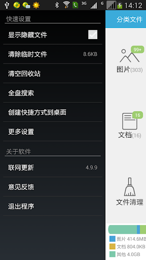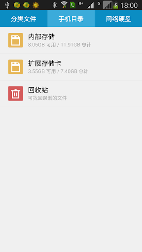 文件分类,极速扫描——快速扫描Android设备上的文件,按图片、音乐、视频、文档、安装包、压缩包等类型整理分类,一目了然,方便查找。