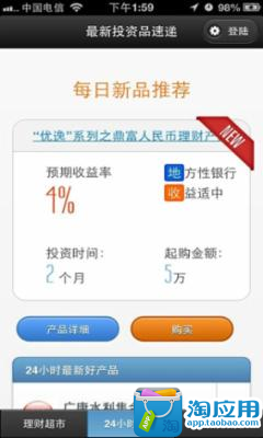 一键对比最新,收益最高的理财产品。范围遍及国债,基金,信托和各大银行发布的理财产品。让理财不再头疼,轻松查询所有产品的收益状况和购买信息。来自您身边的理财专家,易投